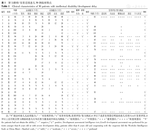 Clinical characteristics of 30 patients with intellectual disability/development delay