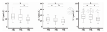 According to age in days after birth, within 1 day after birth for group A, 2-3 days for group B, 4-14 days forgroup C;FC:free carnitine;AC:total acylcarnitines;TC:total carnitine;aP<0.05,bP<0.001