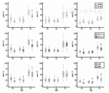 A组中性别、胎龄和出生体质量对FC、AC和TC各指标均有影响,男性、早产儿和低体质量儿高于女性、足月儿和正常体质量儿(P均<0.01); C组中胎龄和出生体质量对FC和TC的影响,出现了与A组一致的趋势(P均<0.01);B组中,各影响因素对上述指标的影响,差异均无统计学意义(P均>0.05),见图2。