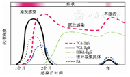 机体感染EBV后针对不同的抗原产生相应的抗体(图1)[3]。原发性EBV感染过程中首先产生针对病毒衣壳抗原(VCA)的IgG和IgM(抗VCA-IgG/IgM);在急性感染晚期,抗EA复合物抗体出现;在恢复期晚期,抗EBV核抗原(EBNA)复合抗体产生。抗VCA-IgG和抗EBNA-IgG可持续终身。EBV特异性抗体检测方法包括免疫荧光法、酶联免疫法、化学发光法等。
