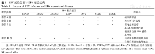 EBV原发感染后会建立终身潜伏感染。EBV潜伏感染可被大致分为4种类型。在健康的EBV既往感染个体,EBV在记忆性B淋巴细胞中潜伏感染,只表达EBV编码的小RNA(EBERs),称为EBV潜伏0型。在EBV感染相关疾病中,EBV有3种潜伏类型。潜伏Ⅰ型,除EBERs外,EBV只表达EBNA1和BamHI A右侧片段(BARTs),如Burkitt′s淋巴瘤;潜伏Ⅱ型,EBV表达EBNA1、LMP1、LMP2、BARTs和EBERs,如鼻咽癌、霍奇金淋巴瘤;潜伏Ⅲ型,EBV表达所有的潜伏基因,如免疫抑制患者的淋巴组织增生性疾病(表1)[1]。