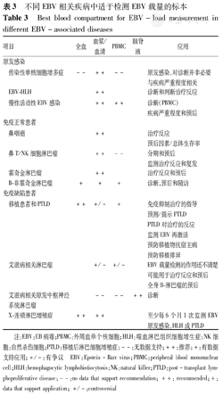 EBV核酸载量检测采用的标本主要是外周血,包括全血、血浆或血清、外周血单个核细胞(PBMC),此外有些疾病可以对脑脊液标本进行检测。对于不同EBV相关疾病进行核酸载量检测所采用的最适合的标本类型有所不同(表3)[14]。