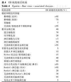 EBERs(EBER1/EBER2)是EBV编码的小分子RNA,并不编码蛋白质。EBERs大量存在于EBV潜伏感染的细胞中,每个细胞可达106~107拷贝,是EBV潜伏感染的最好标志物,其主要功能是抑制干扰素介导的抗病毒效应和凋亡。因此,原位杂交检测EBERs能够定位肿瘤细胞存在EBV,是明确肿瘤与EBV相关的金标准。不同EBV相关疾病中EBERs原位杂交的检出情况见表4[3]。