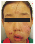 Discrete ulceronecrotic papules,atrophy scars on the face,with a swollen mouth of the children with hydroa vacciniforme-like lymphoproliferative disorders