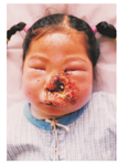 Crusted ulceronecrotic papule in papule a child with extranodal nasal-type natural killer cell/T lymphoblastic lymphoma with a swollen face,the nose is disfi-gurement