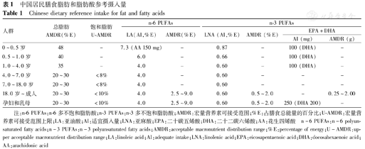 注:n-6 PUFAs:n-6多不饱和脂肪酸;n-3 PUFAs:n-3多不饱和脂肪酸;AMDR:宏量营养素可接受范围;%E:占膳食总能量的百分比;U-AMDR:宏量营养素可接受范围上限;LA:亚油酸;AI:适宜摄入量;LNA:亚麻酸;EPA:二十碳五烯酸;DHA:二十二碳六烯酸;AA:花生四烯酸