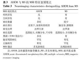 MS与ADEM的鉴别诊断非常重要,二者临床特征差异见表2,二者头颅MRI的不同特征见表3(虽然单次MRI结果有时很难完全区分)[6]。儿童以ADEM更为常见,相对病程短;而MS儿童罕见,病程更长。早期二者有很多重叠之处,故鉴别较困难。一方面,儿童MS可能几个月或几年后未再发作;另一方面,少数ADEM患儿可转化为MS。所以,临床精确预测再发风险也较为困难,长期随访对诊断十分必要。