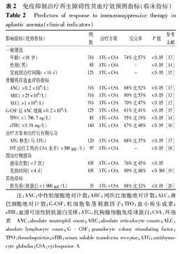 AA发病是由于自身反应性T淋巴细胞克隆活化,造血负调控因子增多,造血干细胞凋亡[2]。IST治疗AA在于清除活化的T淋巴细胞,使残存的骨髓造血得以恢复。从近年来国内外相关报道可见,IST疗效预测指标主要涉及患者的遗传学和免疫学指标(表1)及患者的一般情况、治疗前骨髓残存造血、治疗方案和治疗后近期反应等临床指标(表2)。