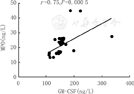 MPP患儿BALF中GM-CSF水平与发热持续时间呈正相关(r=0.42,P<0.05),与其他临床参数无显著相关性。MPP患儿BALF中GM-CSF水平与MPO水平呈正相关(r=0.75,P<0.05),见图2。