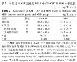 MPP患儿BALF中GM-CSF和MPO水平明显高于对照组(均P<0.01);胸腔积液患儿的GM-CSF和MPO水平明显高无胸腔积液儿童(均P<0.05),见表2。
