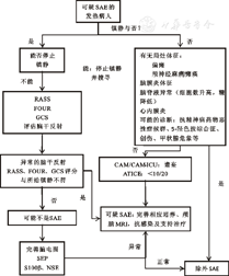 SAE诊断的一个重要内容是神经系统查体。评估脑膜刺激征、病理征、肌力、肌张力、语言、深部腱反射和颅神经可以排除部分其他原因引起的脑功能障碍,比如脑膜炎、代谢性疾病、周围神经病变、颅内占位等。评估眼球运动、瞳孔大小、对光反射、角膜反射、疼痛刺激反应、头眼反射以及吞咽反射在镇静患者中尤为重要,可以帮助识别局灶性脑干病变所致的意识改变[22]。另一个重要节点是对患者目前使用药物的评价。除了常见的苯二氮