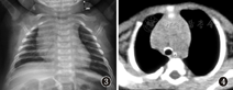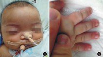 体格检查:神志清,精神差,营养发育可,呼吸急促,口周发绀,面中部发育不良,鼻梁低平(图1),咽部充血,三凹征阳性,双肺呼吸音粗,闻及散在中细湿啰音及哮鸣音。心率162次/min,心音略钝,律齐,心前区未闻及病理性杂音。双上肢末节指骨短小(图2)。