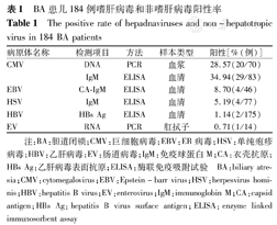 收集2010年1月1日至2014年12月31日广州医科大学附属广州市妇女儿童医疗中心184例BA患儿病历资料。其中男109例,女75例,男女比例1.451.00;病理分型16例为 Ⅰ 型,168例为 Ⅲ 型。患儿明显肝大,部分患者肝脏质地较硬,呈褐色或淤胆样,肝表面粗糙呈颗粒样变或血管增粗,胆囊发育差,肝纤维化,可伴有腹水。3例行MRI或B超检查;98例行腹部探查术,手术年龄(94.39±42.65) d;83例同时行腹部探查术和葛西术(Kasai术),手术年龄(75.22±21.85) d。患儿病理改变符合胆道阻塞性肝改变伴肝损害或肝硬化,患儿均符合BA诊断标准[1]。对照组选用同期门诊和住院非BA的无免疫缺陷患儿,各项目对应对照组分别是巨细胞病毒(CMV) IgM为神经康复科门诊和住院患儿,CMV DNA定量为内分泌病区患儿,EB病毒(EBV)衣壳抗原(CA)-IgM为儿童保健门诊和神经康复科患儿,乙肝病毒(HBV)表面抗原(HBs Ag)为保健科门诊患儿或先天性不完全性腭裂患儿。患儿监护人均签知情同意书,研究经医院医学伦理委员会批准。