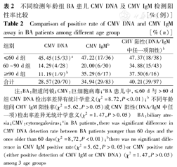 按检测龄不同,将BA患儿分为3组,不同年龄组BA患儿CMV DNA、CMV IgM和CMV阳性率见表2。CMV DNA定量检测,≤60 d组与>60 d组(60~90 d组与≥90 d 2组合并)BA患儿CMV DNA检出率差异有统计学意义(χ2=8.72,P<0.01);CMV IgM检测和CMV DNA+CMV IgM合并分析显示,尚不能认为不同年龄段的3组BA患儿间CMV IgM(χ2=5.62,P>0.05)或CMV检出率差异有统计学意义(χ2=1.47,P>0.05)。