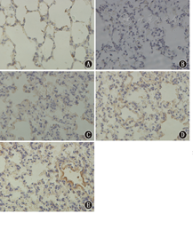 The immunohistochemical staining showing the expression of aquaporin 1 of lung tissue in rats among different groups (×400)