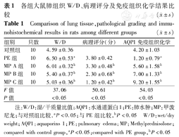 将50只1月龄Wister大鼠随机分为对照组、PE组、MP 10 mg/kg治疗组(MP A组)、MP 20 mg/kg治疗组(MP B组)、MP 30 mg/kg治疗组(MP C组),每组10只。对照组腹腔注射9 g/L盐水,PE组大鼠按2.7 mg/kg给予腹腔注射肾上腺素注射液(11 000), MP各组于腹腔注射肾上腺素注射液后立即腹腔注射MP。苏木精染色观察肺组织形态学改变。测量肺湿/干质量比值(W/D)。免疫组织化学染色分析AQP1的表达和分布,实时定量-聚合酶链反应(RT-PCR)检测AQP1 mRNA的表达,Western blot测定AQP1蛋白表达水平。