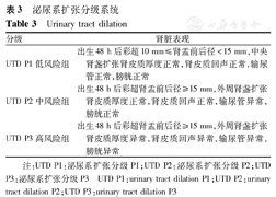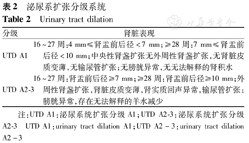 | UTD A2-3 | 16~27周:肾盂前后径≥7 mm;≥28周:肾盂前后径≥10 mm;外周性肾盏扩张,肾脏皮质变薄,肾实质回声异常,输尿管扩张;膀胱异常,存在无法解释的羊水减少 |