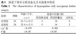 选择2014年1月至2015年5月广西医科大学第一附属医院小儿外科共收治48例尿道下裂并小阴茎患儿[阴茎长度小于正常同龄儿童阴茎长度2.5标准差(SD)[7]]。全组患儿监护人均签署知情同意书并经医院医学伦理委员会审批通过(批号:2014-KY-桂卫-001)。将48例患儿按简单随机对照原则分成试验组和对照组,各24例。试验组在术前使用HCG肌肉注射治疗,对照组术前不使用任何药物治疗。所有患儿的染色体检查均为46,XY。任何有内分泌疾病和尿道下裂手术史的患儿均排除在外。试验组患儿HCG试验均为阳性。手术前2组患儿一般情况比较差异无统计学意义,见表1。