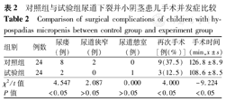 试验组6例患儿接受Duckett联合Duplay尿道成形术式,其余均为Duckett尿道成形术;对照组4例患儿接受Duckett联合Duplay尿道成形术式,其余均为Duckett尿道成形术。试验组平均随访时间为17个月(12~23个月),对照组平均随访时间为20个月(15~28个月)。试验组与对照组在尿瘘发生率、再次手术以及手术时间等方面比较差异均有统计学意义(均P<0.05);在尿道狭窄、尿道憩室等方面差异无统计学意义(均P>0.05),见表2。