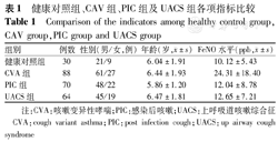 CVA组、PIC组及UACS组FeNO浓度见表1。CVA组患儿FeNO水平与PIC及UACS比较差异有统计学意义(t=4.804、2.391,均P<0.01),3组患儿FeNO浓度与健康对照组比较差异有统计学意义(F=3.63,P<0.05),见表1。