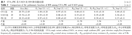 CVA组的响应频率(Fres)、呼吸总阻力(R5)、中心呼吸道阻力(R20)和周边呼吸道阻力(R5-R20)明显高于UACS组及PIC组,差异有统计学意义,见表3。