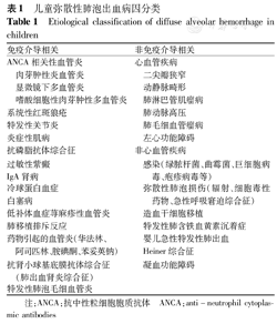 DAH的病因复杂,肺微循环的任何损伤均可能导致肺泡出血。其分类方法也不尽相同,成人DAH最初采用的是2004年Collard和Schwarz[1]的分类法,分为肺小血管炎、免疫相关性疾病、凝血功能障碍、特发性肺含铁血黄素沉着症(idiopathic pulmonary hemosiderosis,IPH)、其他原因引起的疾病5大类;2008年后沿用根据有无血管炎或毛细血管炎将病因归纳为与血管炎、毛细血管炎相关的DAH,与血管炎、毛细血管炎无关的DAH,其他因素导致的DAH 3大类[2,3,5]。儿童DAH的病因分类基本借鉴成人模式,2007年Susarla和Fan[6]提出儿童DAH的病因归纳为肺泡毛细血管炎相关性疾病、无肺泡毛细血管炎及心血管疾病、心血管疾病3大类,这一分类法需要组织病理学检查依据,在儿科临床上由于诸多因素的制约,实际操作时难度大。因此2016年Park[7]借鉴Krause等[8]的归类方法将儿童DAH病因分为免疫介导相关的DAH、非免疫介导相关的DAH,见表1。