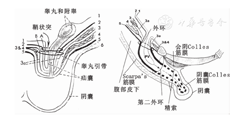 近来在回顾性研究中发现一直写入经典教科书的腹股沟管内外两环和上下前后四壁的构成,早在1933年就有描述"内环"内还有"第二内环"存在,且在1996年还重新发布过了这个结果。更早在1929年的文献就曾有结合胚胎发生学的研究描述了"外环"外还有"第二外环"的存在(图1)[5]。新近通过胚胎学和表面解剖学的系统回顾研究,发现对小儿腹股沟管阴囊区目前很多问题确实仍很不清楚[1]。事实上,腹股沟管的发育除构成其自身各壁的肌肉、腱膜、神经等之外,还与鞘状突、提睾肌、精索、睾丸、附睾及睾丸引带等的发育密切相关,涉及很多内分泌的、神经的动态发育过程,同时它们又与阴囊甚至外生殖器的发育关联,在这个涉及不同发育期和多种结构发育的动态过程中,它们相互影响[6,7]。