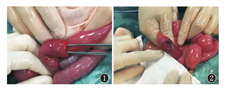 7例患儿诊断为持续性SBI,行手术治疗:4例患儿术中可见病理性诱发点,其中3例为梅克尔憩室,1例为小肠息肉;2例术中证实为SBI,行手法复位成功,未见病理性诱发点(图1、图2);1例患儿术前虽已无临床症状,但多次复查腹部彩超、腹部CT及诊断性对比剂(空气)灌肠仍提示SBI,腔镜探查未见套叠改变,但可见小肠肠壁卡压痕迹。7例患儿住院8~10 d出院,预后均良好。