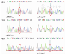 结合患儿病情经过及饮食特点,临床诊断为低血糖脑病,疑似果糖代谢异常。为明确病因,采用新一代基因测序技术进行基因分析(北京福佑龙惠遗传病专科门诊部协助)。对于患儿父母及正常对照DNA样本,采用一代测序方法进行验证。结果显示:患儿FBP1基因检出c.974T>A(p.V325E)和c.755A>T(p.D252V)2个突变,为复合杂合突变,符合果糖-1,6-二磷酸酶缺乏症(图3)。2个突变均为未报道的新突变,c.974T>A来自父亲,突变导致果糖-1,6-二磷酸酶多肽链第325位氨基酸由缬氨酸改变为谷氨酸。c.755A>T来自母亲,导致该多肽链第252位由天冬氨酸改变为缬氨酸。