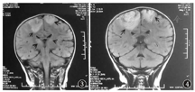 脑脊液检查示颅内压升高,细胞数增加或正常,糖和氯化物正常。该患儿脑脊液检查未见异常。患者早期CT可正常,也可显示广泛的脑组织水肿及白质内低密度灶,可夹杂点状高密度影。MRI的T1加权像表现为广泛的脑组织水肿,单侧或双侧后额部、颞叶或顶叶白质的多发低密度灶,部分病灶可融合成片,从脑室周围延伸至皮质下白质及灰白质交界处,可有明显占位效应[2,3]。MRI的T2加权像和液体衰减反转恢复相对本病更敏感,可见双侧多灶性白质高信号,广泛高信号白质水肿内有多发的斑点状低信号,提示不同阶段的出血[5]。轻症患者脑组织活检实施困难时,可通过头颅影像学检查,做出早期诊断,做出积极治疗,对于改善患者预后有很大帮助。该患儿早期行头颅MRI及CT检查,经积极给予脱水降颅压、激素等治疗后,临床症状改善,复查头颅MRI未见明显改善,考虑可能与影像学检查滞后有关。