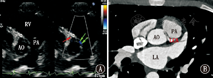 注:AO:主动脉;PA:肺动脉;RV:右心室;LCA:左冠状动脉;A:超声心动图大动脉短轴切面,可见左冠状动脉自右冠窦发出,沿主动脉壁内走行(双箭头所示),右冠状动脉开口位置正常(单箭头所示);B:左冠状动脉起源于右冠状窦心脏CT所见 AO:aorta;PA:pulmonary artery;RV:right ventricle;LCA:left coronary artery;A:transthoracic echocardiography shows the normal origin of the right coronary artery (single arrow) and anomalous left coronary artery running intramural within the anterior aortic wall (double arrows);B:multislice computed tomography image shows anomalous origin of the left coronary artery from the right sinus