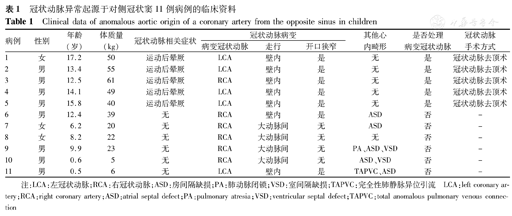 冠状动脉异常起源于对侧冠状窦11例病例的临床资料
