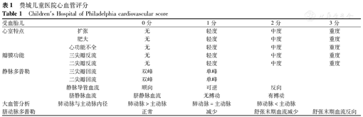 研究显示,胎儿的心功能变化贯穿于TTTS病情发展的全过程,对于该病的预后及转归有重要评估意义。Degenhardt等[16]提出了一个包括心功能变化的评分标准——CHOP心血管评分(表1),来弥补Quintero分期的不足。受血儿心功能的变化与TTTS的病情进展密切相关。研究显示,TTTS分期越高,CHOP心血管评分越高,胎儿心功能越差,而约10%的早期TTTS胎儿也存在心功能异常。CHOP心血管评分主要借助超声心动图,指标包括心室肥大、收缩及舒张功能障碍、三尖瓣及二尖瓣反流、Tei指数等,对于TTTS治疗方案的选择、预后评估、新生儿生存质量预测有很大的指导意义。