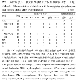 注: AML:急性髓系白血病;ALL:急性淋巴细胞白血病;MAL:急性混合细胞白血病;MDS:骨髓增生异常综合征;SAA:重型再生障碍性贫血;CR:完全缓解;NR:未缓解;aGVHD:急性移植物抗宿主病;CMV:巨细胞病毒;EBV:EB病毒;HC:出血性膀胱炎;PRES:可逆性后部脑病综合征 AML:acute myeloid leukemia;ALL:acute lymphoblastic leukemia;MAL:acute mixed leukemia;MDS:myelodysplastic syndrome; SAA:severe aplastic anemia;CR:complete remission;NR:no remission;aGVHD:acute graft versu shost disease;CMV:cytomegalovirus;EBV:Epstein-Barr virus; HC:hemo-rrhagic cystitis;PRES:posterior reversible encephalopathy syndrome
