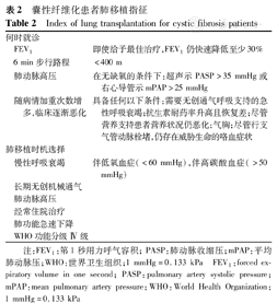 长期感染和炎性反应可引起不可逆的支气管扩张,最终导致呼吸衰竭。终末期治疗仅可选择双肺移植,双肺移植是高风险手术,如何确定最佳手术对象,特别是儿童,目前争议颇大。肺移植指证须符合预测模型要求,即根据第1秒用力呼气容积(FEV1)、年龄、性别、肺部微生物学特征和FEV1下降速率来提示患者是否将面临死亡(如2年之内)。CF患者肺移植指征见表2[29]。肺移植术后5年生存率约为50%,慢性移植排斥反应所致闭塞性细支气管炎是亟待解决的主要问题[30]。