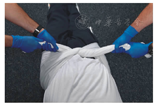 严重的可合并失血性休克和盆腔脏器损伤,需积极控制休克,不稳定的骨盆骨折需先骨盆外固定(图7),可采用一条床单或专用的固定装置以大粗隆为中心包裹住骨盆,后尽快骨科医师介入干预。