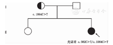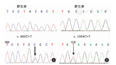 注:A:错义突变c.982C>T(p.R328C);B:错义突变c.1064C>T(p.A355V) A:missense mutation c.982C>T(p.R328C);B:missense mutation c.1064C>T(p.A355V)