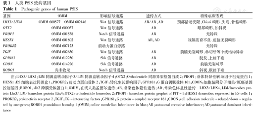 导致PSIS的基因是一系列胚胎发育基因网络,不同突变可导致不同的临床表现。实验表明敲除老鼠的ES细胞表达同源盒1(HESX1)、LIM同源盒转录因子2(LHX2)、NKX2、RAX、TBX3、HEX1或HEX5基因可导致其垂体柄不发育[14,15]。到截稿为止,已经报道导致人类PSIS的基因有10个,见表1。