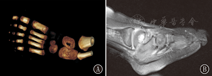 注:A:CT重建示左距骨骨质破坏,周围骨密度稍高;B:MRI示左侧距骨内可见片状长T1长T2信号,压脂像呈高信号,周围软组织肿胀明显 A:CT reconstruction showed talus bone destruction with mild osteosclerosis of bone around the lesion;B:MRI showed lamellar long T1 long T2 was observed in the left of talus,the fat was presented in high signal,and peripheral soft tissue was obvious swelling