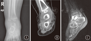 | 2 | 男 | 11个月 | 左踝肿痛 | WBC 12.2×109/L,ESR 30 mm/1 h | 距骨体骨质破坏,周围有明显的增生硬化 | 慢性骨髓炎 |