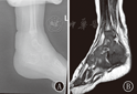 注:A:X线显示距骨骨质密度不均匀降低,踝关节周围软组织肿胀;B:MRI显示左距骨内可见斑片状异常混杂信号影,以长T1长T2信号为主,周围软组织肿胀 A:X-ray showed that there was an uneven decline of bone mineral density in talus bone,and peripheral soft tissue of right ankle was swelling;B:MRI showed patchy mixed signal with the intense T1 and T2 signal as primary key in talus bone and soft tissue masses around the lesion