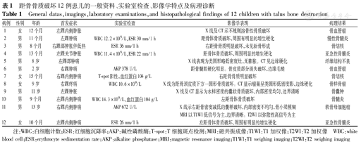 General datas,imagings,laboratory examinations,and histopathological findings of 12 children with talus bone destruction