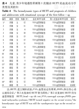 注:HUTT:直立倾斜试验;VVS:血管迷走性晕厥;POTS:体位性心动过速综合征;a第2次复查时HUTT转为阴性;b第2次复查时HUTT仍为血管抑制型 HUTT:head-up tilt test;VVS:vasovagal syncope;POTS:postural tachycardia syndrome;aHUTT turned negative on the second review;bthe hemodynamic type of HUTT was still the vasodepressive type on the second review