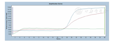 注:蓝色曲线:患儿MLL-AF4融合基因曲线;红色曲线:阳性对照;绿色曲线:阴性对照。当反应Ct值≤ 33时,判定为阳性反应 Blue curve:patient′s MLL-AF4 fusion gene;red curve:positive control;green curve:negative control.Ct value for positive reaction of MLL-AF4 fusion gene is equal to or less than 33
