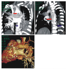 注:MIP:最大密度投影;A:冠状位MIP图,红箭头示上腔静脉蓝箭头示下腔静脉未见;B:矢状位MIP图,红箭头示扩张奇静脉,蓝箭头示迂曲增粗侧支血管;C :VR重建图,左侧肺动静脉细小,右侧肺动静脉形态正常MIP:maximum intensity projection;A:coronal MIP map, the red arrow shows the superior vena cava, the blue arrow shows no inferior vena cava;B: sagittal MIP reconfiguration, the red arrow shows dilated azygos vein, the blue arrow shows tortuous dilated collateral vessels;C: virtual reality reconstruction images, the arrows shows the left pulmonary arteriovenous is small, the right pulmonary arteriovenous is normal