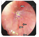 The arrows showing the blood vessels in the bronchial mucosa were obviously enlarged and protruded in child with severe congenital neutropenia caused by ELANE and SH2D1A mutation