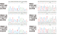 心电图:窦性心动过速。胸部及腹部CT:(1)支气管肺炎;(2)脂肪肝;(3)胆胰脾未见异常。血糖:0.3 mmol/L,酮体:+++,血常规:白细胞(WBC):38.56×109/L,红细胞(RBC):4.14×1012/L,血红蛋白(Hb):92 g/L,血小板(PLT):772×109/L,余项未见异常。C反应蛋白(CRP):16.63 mg/L;PCT:2.17 μg/L;血生化:肌酶及血脂正常,ALT:53 U/L,AST:107 U/L,二氧化碳(CO2)结合力:17.4 mmol/L,总蛋白:50 g/L,清蛋白:36 g/L,球蛋白:14 g/L,肌钙蛋白T:0.033 μg/L。脑钠肽前体:1 358 ng/L;血浆乳酸:1.73 mmol/L;铜蓝蛋白:0.19 g/L;血氨:51.3 μmol/L。血串联质谱结果(2016-9-1):肉豆蔻烯酰肉碱(C14:1)及肉豆蔻二烯酰肉碱(C14:2)增高,分别为0.69和0.25,伴游离肉碱(C0,4.8)及多种酰基肉碱[丙酰肉碱(C3),0.28、丁酰肉碱(C4),0.04]降低,提示极长链酰基辅酶A脱氢酶缺乏症。尿液有机酸气相色谱分析:无显著异常;治疗1周后复查:与前次结果比较,增高的酰基肉碱降至正常。分子遗传检测报告见表1、图1。