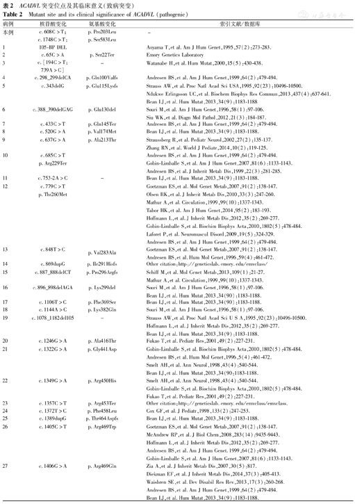 以"ACADVL"为检索词,检索中国知网(CNKI)数据库、万方数据库(建库至2016年12月)、PubMed数据库(建库至2016年12月)、在线人类孟德尔遗传数据库(OMIM)以及HGMD数据库,迄今已报道166种ACADVL基因突变类型,国内仅有5篇[3,4,5,6]文章报道了22例ACADVL基因突变导致的VLCADD。国外文献报道总结诸多ACADVL基因突变导致的VLCADD患者。现将国内外文献报道的73种与VLCADD有关的基因突变类型及本例2个新发突变共75例的资料总结如下,有105-BP DEL等31个是致病突变(表2),其中错义突变有27个,无义突变有4个,缺失有2个,且以错义突变最为常见。且有报道称c.343delG(p.Gln100Valfs)与VLCADD心肌病型有相关性[7],c.637G>A(p.Ala213Thr)与该病的肝型有相关性[8]。有c.-63_-49dupGGGCGTGCAG-GACGC等9个突变是良性变异,NG_007975.1:g.5088T>C等26个突变是临床意义未明,NM_000018.3(ACADVL):c.623-8C>T等7个致病性有争议的。
