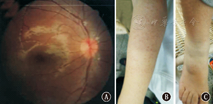 注:A:右眼球结膜充血;B:臂部陈旧皮疹;C:右踝关节肿胀 A:the right eye revealed conjunctival congestion;B:papules on the upper limb;C:boggy swelling of the right ankle joint