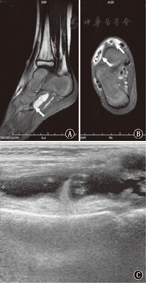 注:A、B:磁共振成像结果显示右踝关节周围软组织内囊性病变(箭头示);C:彩超结果显示右膝关节髌上囊积液,囊壁毛糙增厚 A,B:soft tissue cystic lesions of magnetic resonance imaging scan of the right ankle joint(marked by white arrow);C:ultrasonography of the right knee showed effusion and synovial thickening